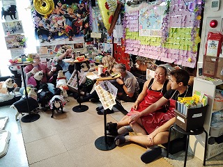 △エプロンを貸し出していますが、迫力満点!想定外の数のパグ達に埋もれますので、ドレスコードはありませんが、あらゆるモノが付きますので?!付いても大丈夫なパグカフェTPOをお守りください。