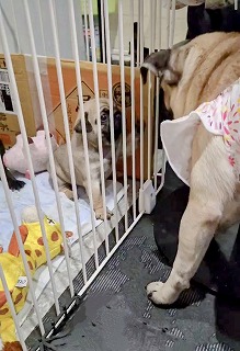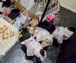 6/15生まれ、Sallyベビー達、カフェのパピールームに引っ越してきました♡目も耳も早く、離乳食も! 親戚の、パグ達もかわいい甥っ子、姪っ子を優しく受け入れ♡ これから巣立ちまでトレーニングがはじまります!!かわいい盛り、見に来てくださいね♡
