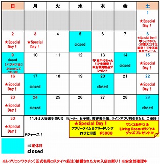 11月の営業日カレンダーでました。ようやく涼しくなり、京都の紅葉もいよいよ本番に🍁11月は今年も大好評のドジャースの大谷選手祭りを開催します‼️パグ達は大谷選手のユニフォームで皆様をお出迎え💕 現在、可愛い生後4ヶ月〜ベビパグ達も‼️ カフェでは、1日4時間限定でパグたちと触れ合うことができます✨️ ここは普通の動物カフェとは違い、パグ愛好家の為のパグの夢の国です‼️ 白パグ、毛色の違うパグ、デカパグ、ミニパグ、保護犬、そして6世代にわたる子犬からシニア犬まで全てパグ愛好家のオーナーの大切な家族です。パピールームには4ヶ月、10ヶ月、11ヶ月の赤ちゃんパグ達が社会化トレーニング中です❤️ 保護犬活動も行っており、ご支援としてオプションで子犬と遊べるおやつをご注文(寄付)頂けます✨️皆様のご来店お待ちしております‼️