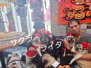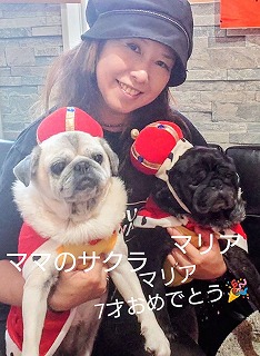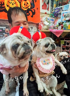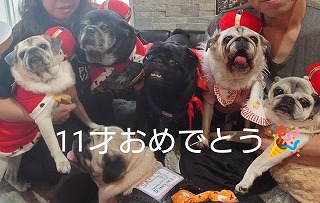 滋賀の、モモ&メルちゃん(11)が里帰りにありがとうございました❤️ パグカフェの、15才7ヶ月まで頑張った溺愛犬初代くぅ〜ボスからはじまり、親子6世代!最初の里親さんのもとへ巣立った、白パグのメイ様とアイノスケの子の滋賀の11才になるモモ&メルちゃん、京都のフウタくん(看板犬のライタ、サクラの同胎きょうだい)、きょうだい、家族みんなで元気に11才の誕生日(10/10生まれ)を迎えることができました‼️ また、サクラの娘の7才(10/22生まれ)になるマリアも、合同で誕生日ケーキでお祝いしました❤️ みんなにお差し入れいつもありがとうございます❤️