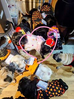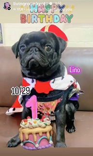 10.29 リノちゃん、1才おめでとう🎉🎂 きょうだい達もおめでとう🎉 おかげさまで元気に、カフェでも1000年に一度の可愛い美黒パグ⁉️で、社会化トレーニング中でパピールームにて皆様を癒し中‼️ これからも、みんなとたくさんの思い出を作ろうね💕 🐶ベルちゃん(3)と、黒パグのムーンくん(2)との子供です♫パパにそっくりです💕 🐶ベルちゃんの3回目の出産の子で、同胎きょうだいが他に、ちくわくん、チャンくん、大吉くんの4きょうだい😘11月にまた合同ハピバ予定❤️ 🐶パピールームでは、年の近い、マコちゃん(1)、豆千代ちゃん(11ヶ月)と仲良し💕ロミオくん(4ヶ月)とはLoveLove💕 次世代の可愛いリノちゃんの成長をこれからも一緒に見守ってもらえましたら✨️応援宜しくお願いします😊💕 常連さん皆様、みんなの大好きなお芋差し入れもありがとうございました‼️
