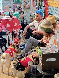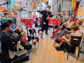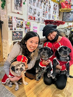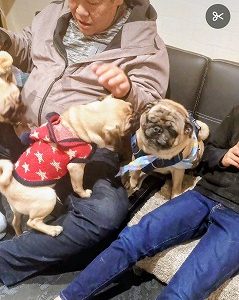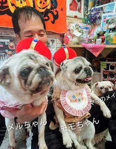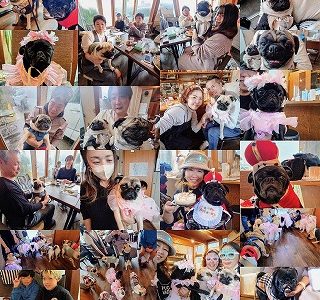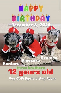 12/3 シニア三兄弟の、長男アイノスケくん、次男カンタロウくん、三男ゴンタロウくんが、無事に兄弟そろって元気に12才を迎えることができました‼️みんなの大好物のお芋プレゼント、海外からも三兄弟ファンがわざわざ駆けつけてくださり、国内外から常連さん達に祝ってもらえて、三兄弟も幸せです‼️目も耳も悪くなり、イボや足腰ヘタりはじめてますが、毎朝健康チェックをし、彼らが生きがいとリハビリにもなっているカフェで、三兄弟お互いに励ましあい支えあって、皆様との楽しいひとときを1日でも長く過ごしてもらえたらと願っています❤️私達のカフェは、きれいで元気な若い子達だけをお見せするのでなく、パグはシニア期の独特な可愛さがあり癒しの塊‼️ありのままのシニアパグ達も体調を見ながらカフェでお見せしています‼️パグ愛好家ならたまらないパグの地上の楽園を満喫しにきてくださいね❤️