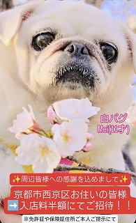 滋賀の、モモ&メルちゃん(11)が里帰りにありがとうございました❤️ パグカフェの、15才7ヶ月まで頑張った溺愛犬初代くぅ〜ボスからはじまり、親子6世代!最初の里親さんのもとへ巣立った、白パグのメイ様とアイノスケの子の滋賀の11才になるモモ&メルちゃん、京都のフウタくん(看板犬のライタ、サクラの同胎きょうだい)、きょうだい、家族みんなで元気に11才の誕生日(10/10生まれ)を迎えることができました‼️ また、サクラの娘の7才(10/22生まれ)になるマリアも、合同で誕生日ケーキでお祝いしました❤️ みんなにお差し入れいつもありがとうございます❤️